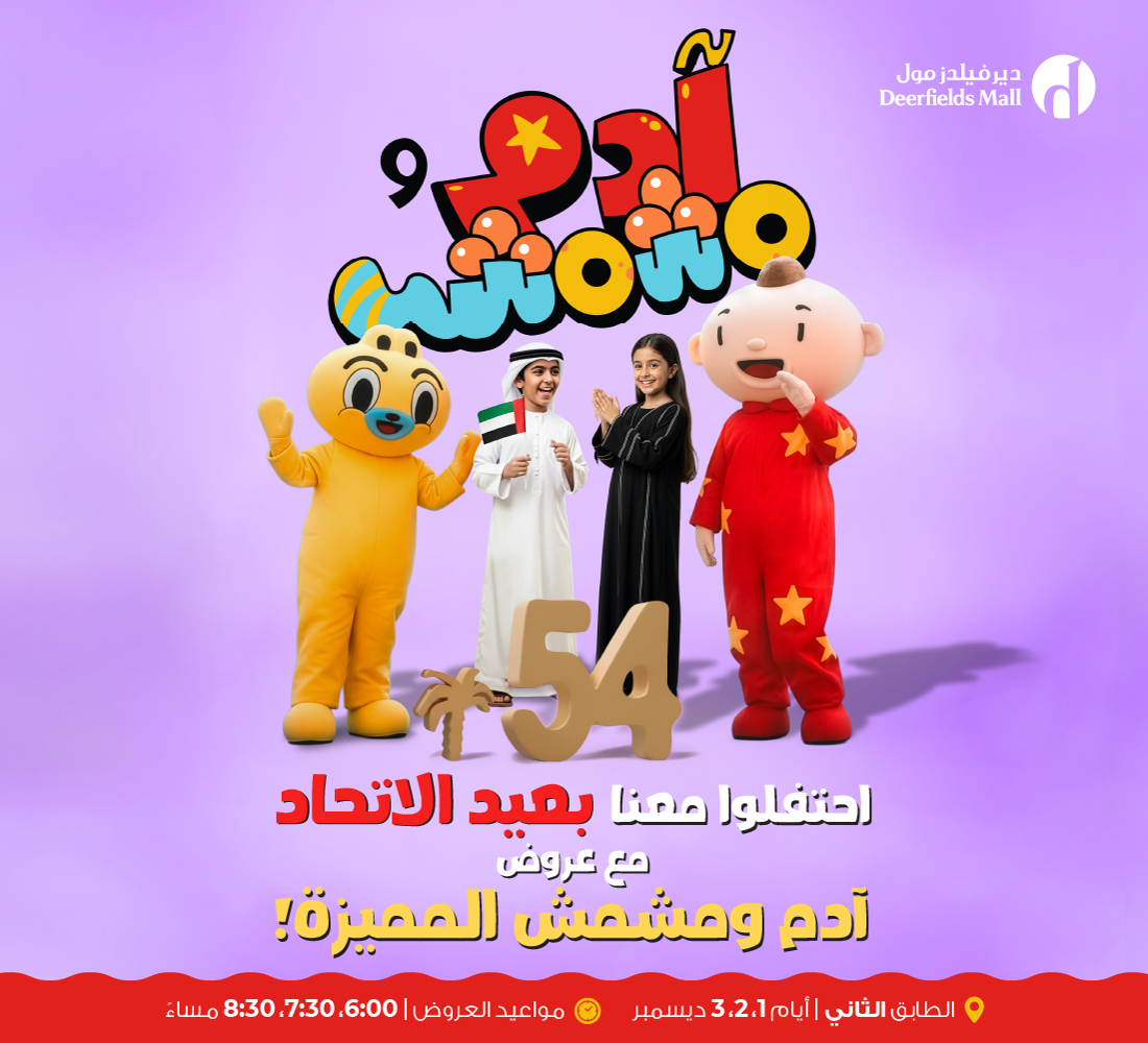 احتفالًا بـ عيد الاتحاد، يقدّم ديرفيلدز مول شخصيات آدم ومشمش المحبوبة في عرض مباشر مليء بالموسيقى والقصص والتفاعل الممتع للأطفال من جميع الأعمار.