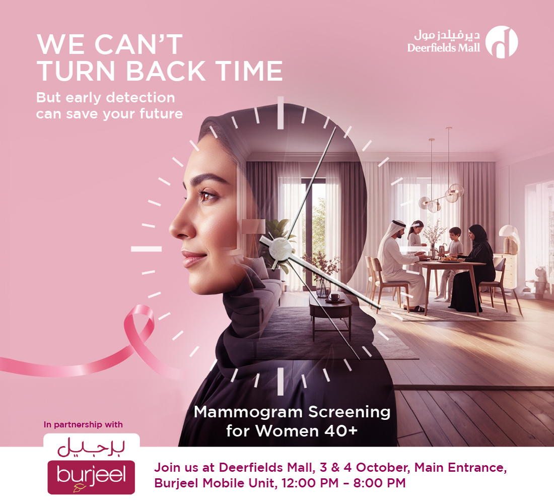 Deerfields Mall, in collaboration with Burjeel Hospital, is pleased to host a dedicated Mammogram Screening Campaign on 3 and 4 October at the Main Entrance of the mall. A state-of-the-art Burjeel Mobile Unit will be available from 12:00 PM to 8:00 PM, providing convenient access to essential health services for the community.